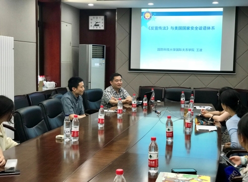 2018年6月29日下午,国防科技大学国际关系学院王波教授应英语系美国社会文化研究中心的邀请,在外交学院展览路校区主楼213会议室做了题为“《反宣传法》与美国国家安全话语体系”的讲座。讲座由英语系主任石毅教授主持,英语系部分教师和本科生参加。